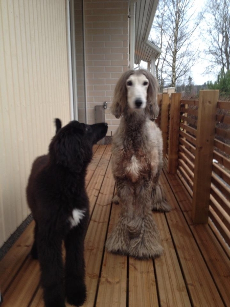 Väga tore oli kuulda et Essiel olid sünnikennelis omandatud head oskused pere suurte koertega  suhtlemisel kohe “varnast võtta”   ja tutvumine  uute sõpradega sujus esimesest hetkest – peres on Shih-Tzu’s and Afgaani hurt ning juba teisel päeval magas ta nendega kaelakuti samas pesas.